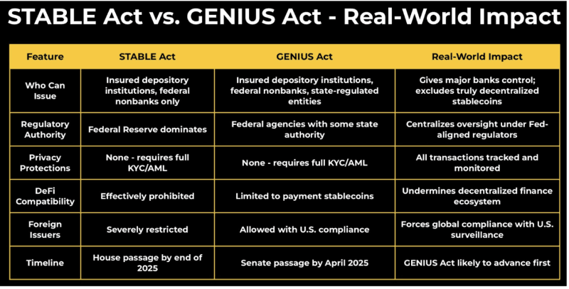 The STABLE Act bans unauthorized issuers, while the GENIUS Act prohibits unapproved payment stablecoins, ensuring only the financial elite can play. Both mandate strict Know Your Customer (KYC) and Anti-Money Laundering (AML) requirements, turning every transaction into a surveillance opportunity. Algorithmic stablecoins used in DeFi platforms, which thrive on anonymity and decentralization, are effectively sidelined, as banks and the Fed tighten their grip on the digital dollar ecosystem. This isn’t innovation—it’s a power grab, cloaked as financial stability.